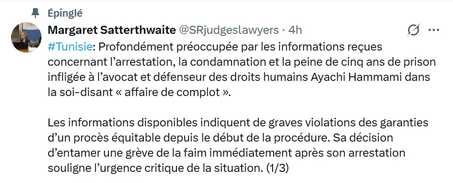 Une préoccupation partagée par Margaret Satterthwaite, rapporteuse spéciale des Nations unies sur l’indépendance des juges et des avocats. Elle s’est dite « profondément préoccupée » par les informations concernant l’arrestation, la condamnation et l’incarcération d’Ayachi Hammami dans la « soi-disant affaire de complot ». Elle a évoqué de « graves violations des garanties d’un procès équitable depuis le début de la procédure ». Selon elle, la décision d’Hammami d’entamer immédiatement une grève de la faim souligne « l’urgence critique de la situation ».