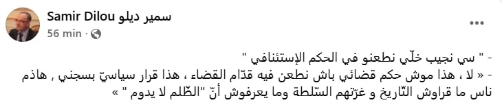 Samir Dilou, ancien ministre et avocat, a partagé un échange qu’il a eu avec Ahmed Néjib Chebbi : « – “M. Néjib, faut-il faire appel de la décision de la Cour d’appel ?” – “Non, ce n’est pas un jugement judiciaire que l’on peut contester devant la justice, c’est une décision politique de m’emprisonner. Ces gens n’ont pas étudié l’histoire, le pouvoir les a trompés, et ils ignorent que ‘l’injustice ne dure jamais’.” »