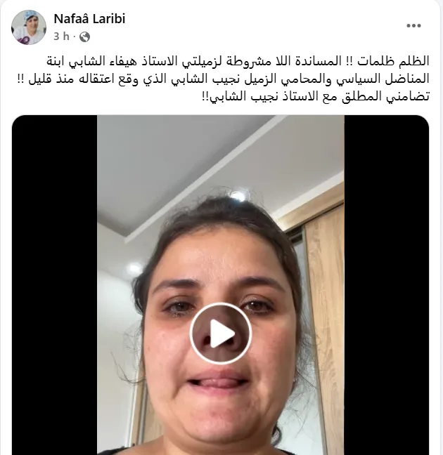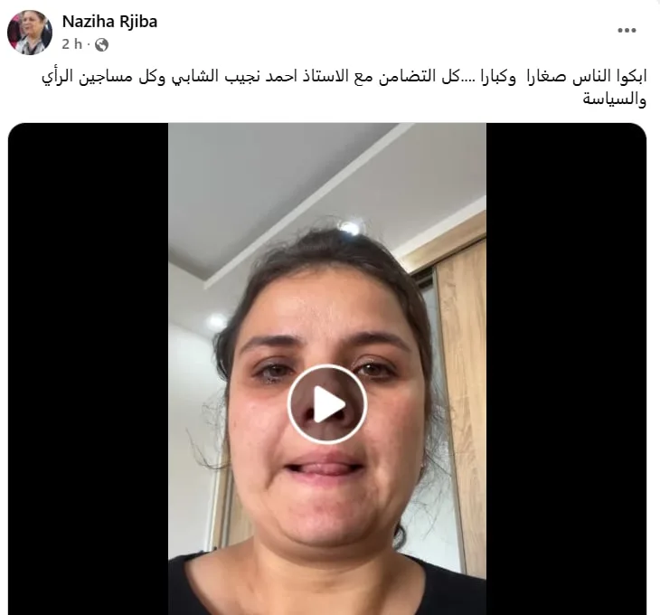 La militante Naziha Rejiba a relayé la vidéo d’Haifa Chebbi, la fille d’Ahmed Néjib, qui annonçait l’arrestation de son père en larmes : « Ils ont fait pleurer les gens, jeunes et adultes… Tout notre soutien à M. Ahmed Néjib Chebbi et à tous les prisonniers d’opinion et de politique. »