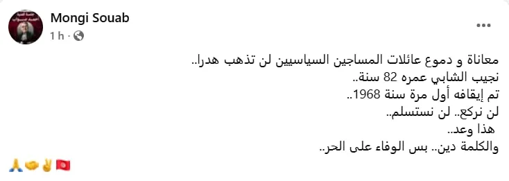 Le syndicaliste Mongi Souab, frère du prisonnier politique Ahmed Souab, a insisté sur la continuité de la résistance : « La souffrance et les larmes des familles des prisonniers politiques ne seront pas vaines… Néjib Chebbi a 81 ans. Il a été arrêté pour la première fois en 1968. Nous ne plierons pas, nous ne céderons pas. C’est une promesse… et la parole donnée à un homme libre est sacrée ».