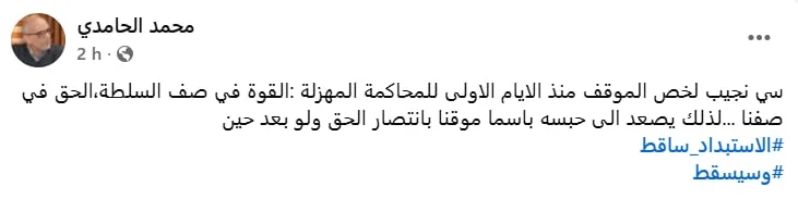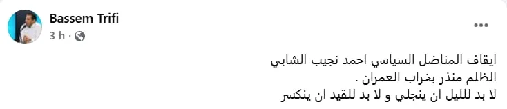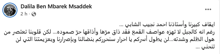L’avocate Dalila Ben Mbarek Msaddek, sœur du prisonnier politique Jaouhar Ben Mbarek, a exprimé sa solidarité et son indignation : « L’arrestation de notre grand maître et professeur Ahmed Néjib Chebbi… Malgré sa solidité semblable à celle d’un mont et sa longue expérience face aux tempêtes de la répression, il a goûté à l’amertume et lui fait subir la dureté de sa résilience. Nos cœurs se serrent devant l’ampleur de cette injustice, mais votre emprisonnement ne durera pas, chers libres. Nous vous libérerons par notre lutte, notre détermination et notre volonté inébranlable ».