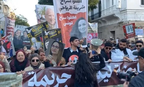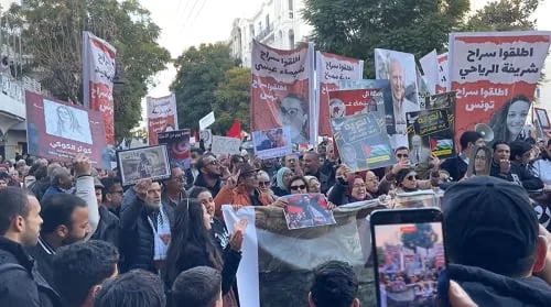 Les manifestants scandent « L’État policier, c’est fini ! », « Nous voulons les libertés ! », « À bas la dictature ! » ou encore « Libérez la Tunisie ! ». Plusieurs pancartes portent les visages de figures actuellement détenues, parmi lesquelles Ahmed Néjib Chebbi ou Ahmed Souab, mais aussi d’activistes et de militants des droits humains, brandies comme symboles d’une opposition bâillonnée.