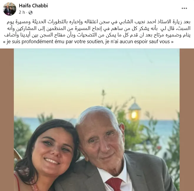 À l’issue d’une visite rendue à son père, Ahmed Néjib Chebbi, actuellement en détention, Haifa Chabbi a rapporté, dans une publication sur les réseaux sociaux, les propos et le message adressés par le dirigeant politique à ses soutiens.