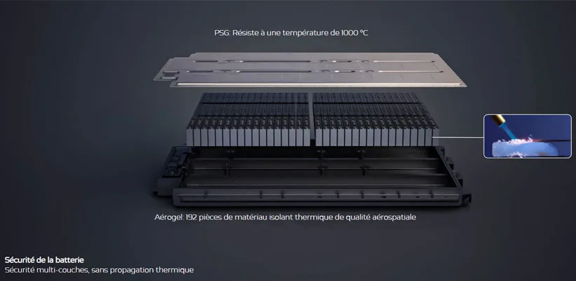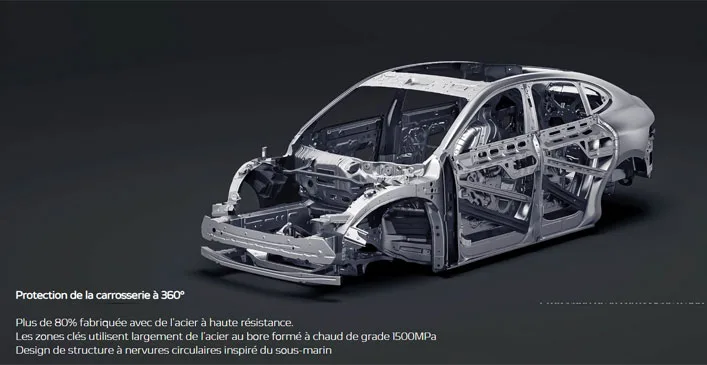 - Structure de carrosserie combinant acier et aluminium avec “structure cage inspirée des sous-marins”, incluant 29,13 % d’acier au bore formé à chaud 1500 MPa, pour une “protection 360°”.