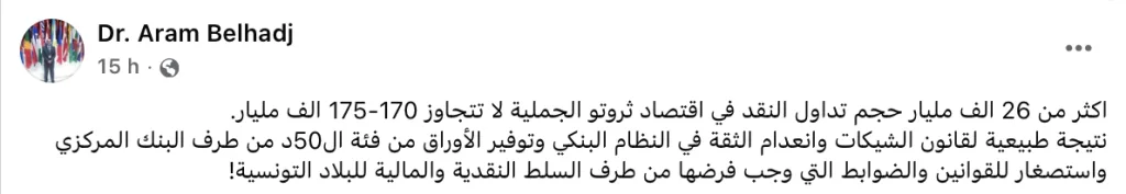 « Plus de 26 mille milliards représentent le volume de la circulation monétaire dans une économie dont la richesse totale ne dépasse pas 170 à 175 mille milliards. Un résultat naturel dû à la loi sur les chèques, à l’absence de confiance dans le système bancaire, à l’émission de billets de 50 dinars par la Banque centrale, ainsi qu’au manque de sérieux dans l’application des lois et des règles qui devraient être imposées par les autorités monétaires et financières du pays », lit-on sur sa page Facebook.