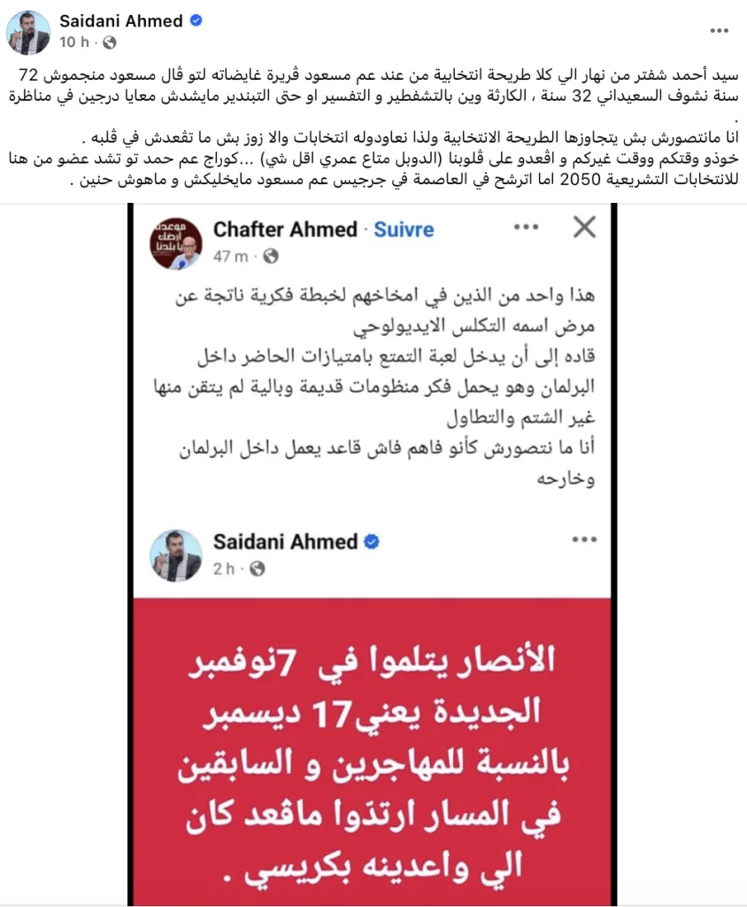 Dans un premier message, Ahmed Saïdani s’en est pris aux anciens du processus du 25-Juillet, les accusant d’avoir retourné leurs vestes.