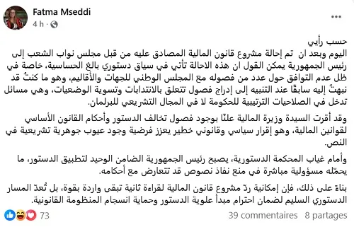 En l’absence de Cour constitutionnelle, Fatma Mseddi estime que le président de la République assume la responsabilité exclusive de veiller à la conformité du texte transmis. Elle considère dès lors que le renvoi du projet de Loi de finances pour une nouvelle lecture constitue « le chemin constitutionnel adéquat » afin de garantir la suprématie de la Constitution et la cohérence de l’ordre juridique.