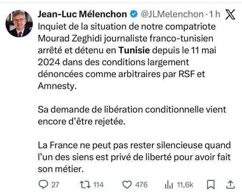 Dans un message publié sur le réseau social X, Jean-Luc Mélenchon a indiqué que les conditions de détention de Mourad Zeghidi sont « largement dénoncées comme arbitraires » par Reporters sans frontières et Amnesty International. Il a également rappelé que la demande de libération conditionnelle du journaliste venait d’être de nouveau rejetée. Estimant que Mourad Zeghidi est privé de liberté pour avoir exercé son métier, il a affirmé que « la France ne peut pas rester silencieuse quand l’un des siens est privé de liberté pour avoir fait son métier ».