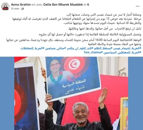 La sœur de Chayma Issa annonce également l’organisation d’une mobilisation de soutien, prévue à 16 heures devant la prison des femmes de la Manouba, affirmant que les proches et les soutiens resteront mobilisés pour défendre son droit à la vie et à une santé préservée.