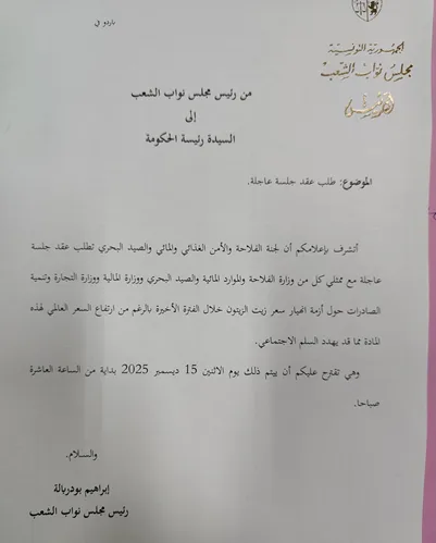 Dès le vendredi 12 décembre, le président du Parlement, Brahim Bouderbala, avait officiellement saisi la cheffe du gouvernement afin de réclamer l’organisation d’une réunion urgente consacrée à la dégradation jugée « préoccupante » des prix de l’huile d’olive sur le marché local. Cette initiative faisait suite à une demande de la Commission de l’agriculture, de la sécurité alimentaire, de l’eau et de la pêche, appelant à une séance réunissant les ministères de l’Agriculture, des Finances et du Commerce.