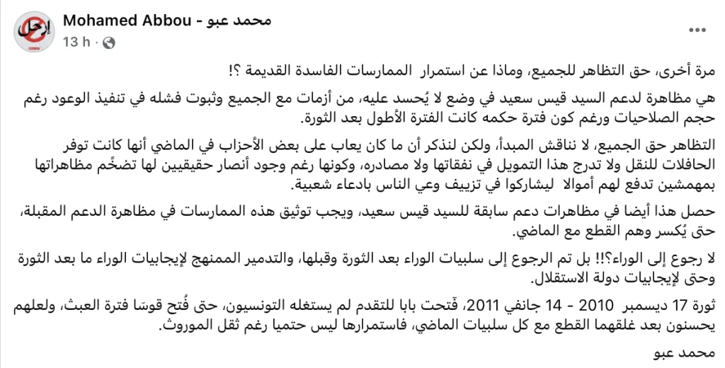« Une fois encore, le droit de manifester est reconnu à tous. Mais qu’en est-il de la persistance des anciennes pratiques de corruption ? Il s’agit d’une manifestation de soutien à Kaïs Saïed, dans une situation peu enviable, marquée par des crises ouvertes avec l’ensemble des acteurs et par l’échec avéré de la mise en œuvre de ses promesses, en dépit de l’étendue des prérogatives dont il dispose et bien qu’il ait exercé la plus longue période de gouvernance depuis la Révolution », a-t-il écrit, dans la soirée de lundi 15 décembre 2025.