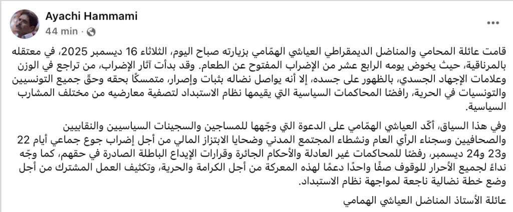 La famille de l’avocat et militant Ayachi Hammami a annoncé, mardi 16 décembre 2025, lui avoir rendu visite à la prison de Mornaguia, alors qu’il entamait son quatorzième jour de grève de la faim pour protester contre son incarcération.