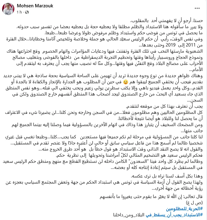 Dans une publication longue et argumentée partagée mardi 16 décembre 2025, le politicien Mohsen Marzouk a livré une analyse critique de la situation politique en Tunisie, mêlant condamnation sans ambiguïté de l’autoritarisme actuel et exercice appuyé d’autocritique collective visant la classe politique de l’après-2011.
