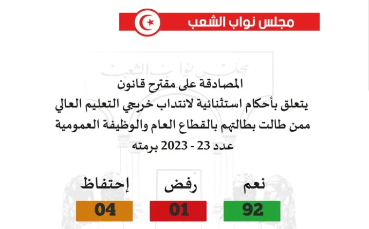 L’Assemblée des représentants du peuple (ARP) a adopté, en séance plénière, ce mardi 16 décembre 2025, le projet de loi n°23-2023 portant des dispositions exceptionnelles pour le recrutement dans la fonction publique des diplômés de l’enseignement supérieur dont la période de chômage s’est prolongée.