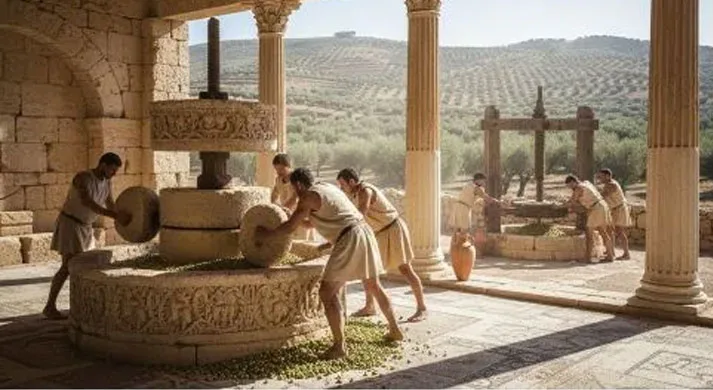 Avec l’arrivée des Romains, l’olivier devient un véritable moteur économique. Les techniques de pressage évoluent avec des presses à levier plus efficaces et des huileries plus nombreuses. L’huile tunisienne voyage alors dans tout l’Empire, vers Rome, Alexandrie ou Carthage.