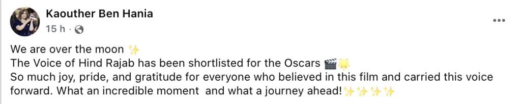 « Nous sommes aux anges. La Voix de Hind Rajab a été présélectionnée pour les Oscars. Tant de joie, de fierté et de gratitude pour tous ceux qui ont cru en ce film et ont fait entendre cette voix. Quel moment incroyable et quelle aventure nous attend ! », a-t-elle écrit sur Facebook.