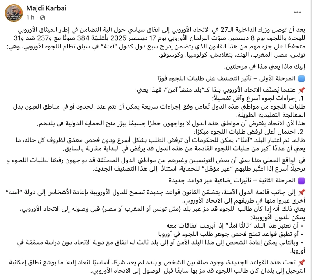 L’ancien député et activiste Majdi Karbai a annoncé jeudi 18 décembre 2025 dans une publication sur sa page Facebook l’adoption en partie par le Parlement européen du Pacte européen sur la migration et l’asile, incluant une liste de pays considérés comme « pays d’origine sûrs ».