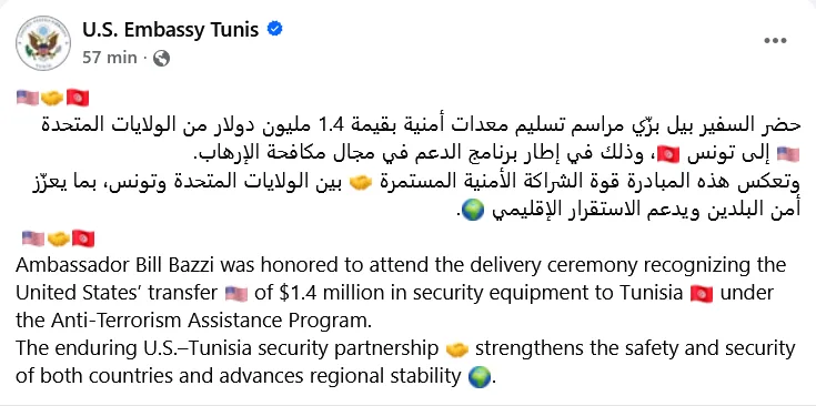 L’ambassadeur des États-Unis d’Amérique en Tunisie, Bill Bazzi, a pris part à la cérémonie de remise d’équipements de sécurité d’une valeur de 1,4 million de dollars des États-Unis au profit de la Tunisie, dans le cadre du programme américain de soutien à la lutte contre le terrorisme. L’annonce a été faite par l’ambassade des États-Unis à Tunis, jeudi 18 décembre 2025.