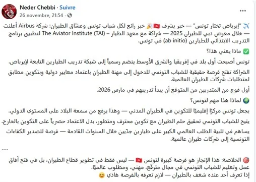 Selon ces messages, Airbus aurait conclu un partenariat avec The Aviator Institute (TAI) afin de mettre en place en Tunisie un programme de formation ab initio, faisant du pays le premier en Afrique et au Moyen-Orient à intégrer officiellement le réseau de formation de pilotes d’Airbus. Les publications évoquent également une opportunité majeure pour les jeunes Tunisiens et indiquent que le premier groupe de stagiaires débuterait sa formation en mars 2026.