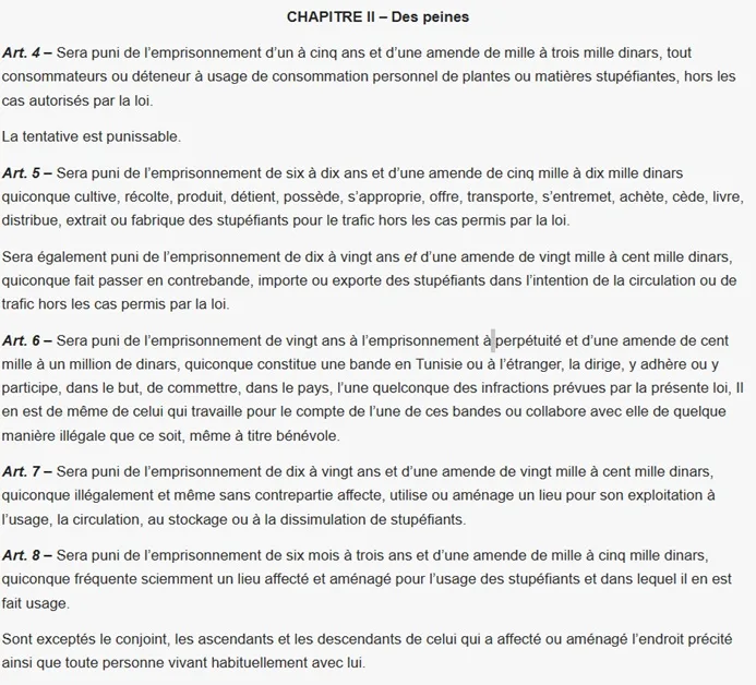 En droit tunisien, la matière des stupéfiants est principalement régie par la loi n°92-52 du 18 mai 1992. Ce texte réprime de manière sévère la production, la détention, la consommation, le transport, la distribution et la facilitation de l’usage de stupéfiants. En revanche, il ne prévoit pas de sanction pénale pour le simple fait d’être assis en présence d’un trafiquant, que ce soit dans un domicile ou un local commercial. Pour qu’une infraction soit constituée, la loi exige des éléments matériels précis : participation à l’infraction, aide ou assistance, dissimulation, mise à disposition d’un lieu en connaissance de cause, ou encore consommation ou détention de substances interdites.