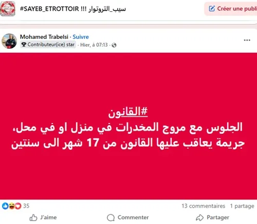 Une publication largement relayée sur les réseaux sociaux affirme que « s’asseoir avec un trafiquant de drogue dans une maison ou un local constitue un crime puni par la loi de 17 mois à deux ans de prison ». Présentée comme une disposition claire du droit tunisien, cette affirmation suscite inquiétude et confusion. Vérification faite, elle ne correspond pas au cadre légal en vigueur.