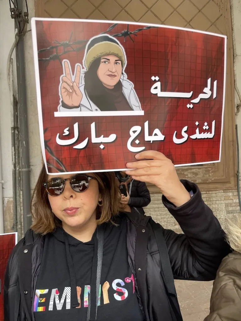 À l’appel de plusieurs acteurs de la société civile et du Syndicat national des journalistes tunisiens (SNJT), les participants ont exprimé leur solidarité avec la journaliste, dénonçant la poursuite de sa détention et le prolongement de la procédure judiciaire.