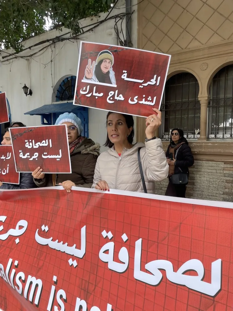 Un sit-in de soutien à la journaliste Chadha Haj Mbarek s’est tenu dans la matinée du vendredi 26 décembre 2025 devant le tribunal de Bab Bnet, à Tunis, en marge de l’ouverture de la deuxième audience en appel dans le cadre de l’affaire « Instalingo ».