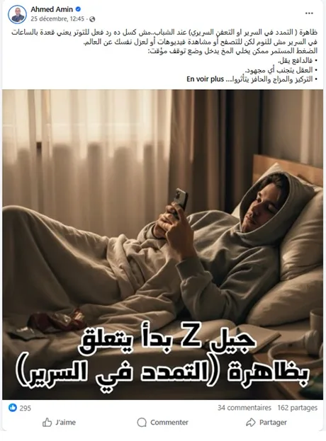 Sur Facebook, des publications largement partagées affirment l’existence d’un phénomène qualifié de « décomposition clinique », présenté comme la conséquence directe de l’attachement de la génération Z au téléphone portable et de sa tendance à rester alitée pendant de longues périodes. Le terme, inhabituel et anxiogène, a rapidement suscité interrogations et inquiétudes en Tunisie, alimentant débats et réactions alarmistes sur les réseaux sociaux.