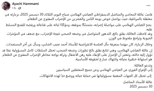 Selon le communiqué publié par la famille du détenu, Ayachi Hammami maintient fermement sa décision de poursuivre son mouvement de protestation. Il réaffirme son attachement à ses convictions, son refus de la répression dont il fait l’objet et sa détermination à aller au bout de sa démarche. La famille a toutefois constaté, avec une vive inquiétude, une détérioration continue de son état de santé, marquée notamment par un affaiblissement des indicateurs vitaux et une perte de poids significative.