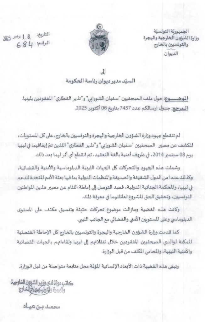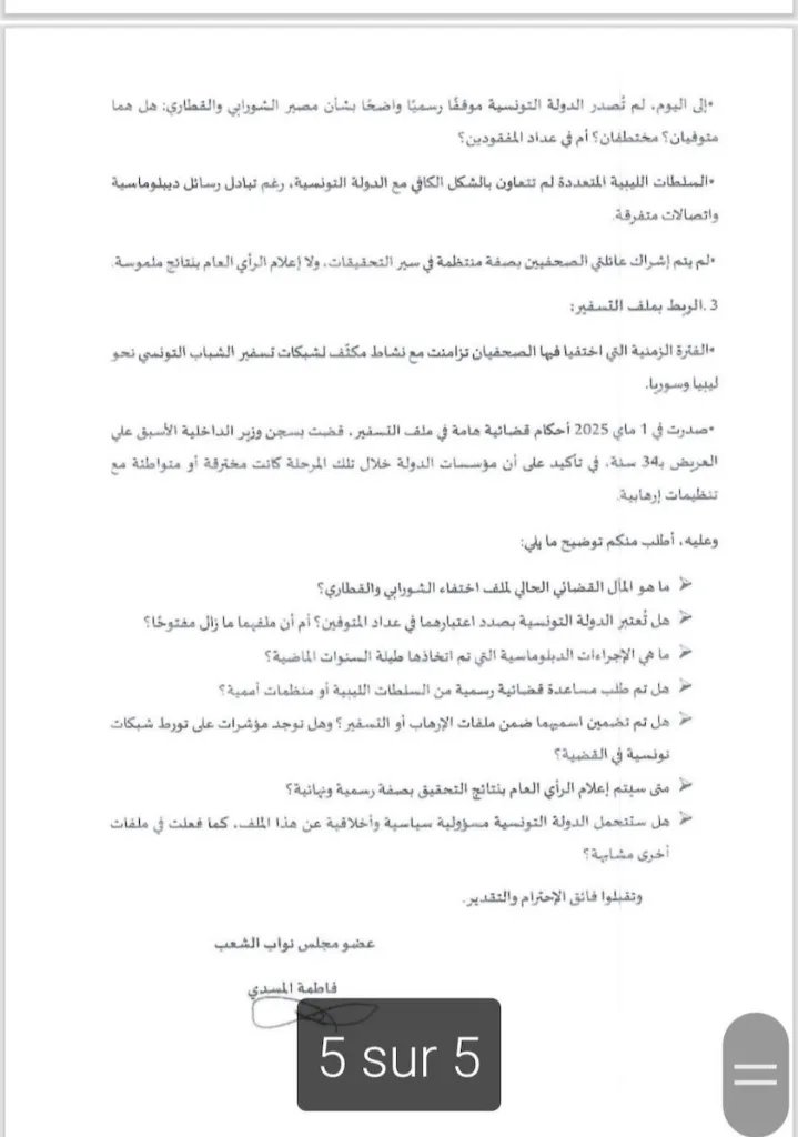 En réponse à une correspondance adressée par la députée Fatma Mseddi le 23 juillet 2025, le département de Mohamed Ali Nafti a assuré que « les efforts n’ont jamais cessé » sans apporter de détails concrets sur l’état judiciaire du dossier, ni sur le sort exact des deux journalistes.