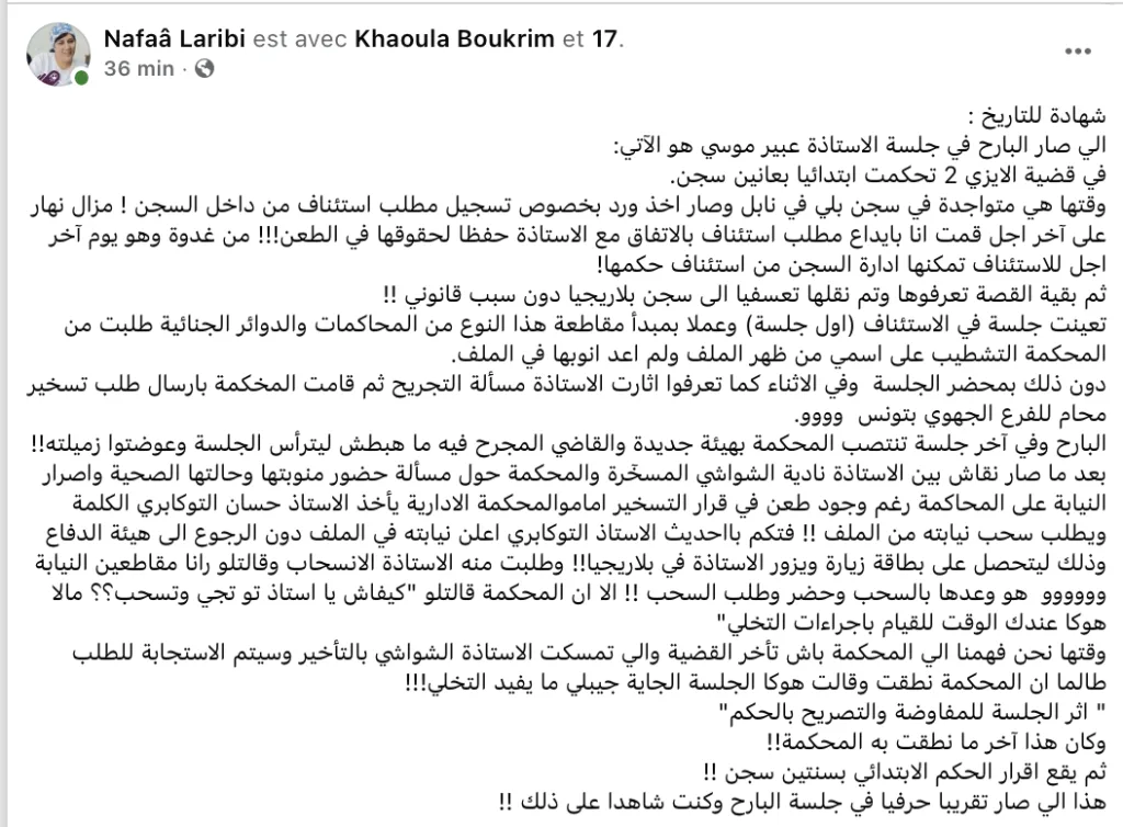 Dans une publication sur sa page Facebook, l’un de ses anciens avocats, Nafaâ Laribi, présent à l’audience, a implicitement dénoncé le déroulement de l’audience expliquant que la Cour a siégé sous une nouvelle composition; le magistrat objet d’une demande de récusation n’étant pas présent et ayant été remplacé par une autre juge.