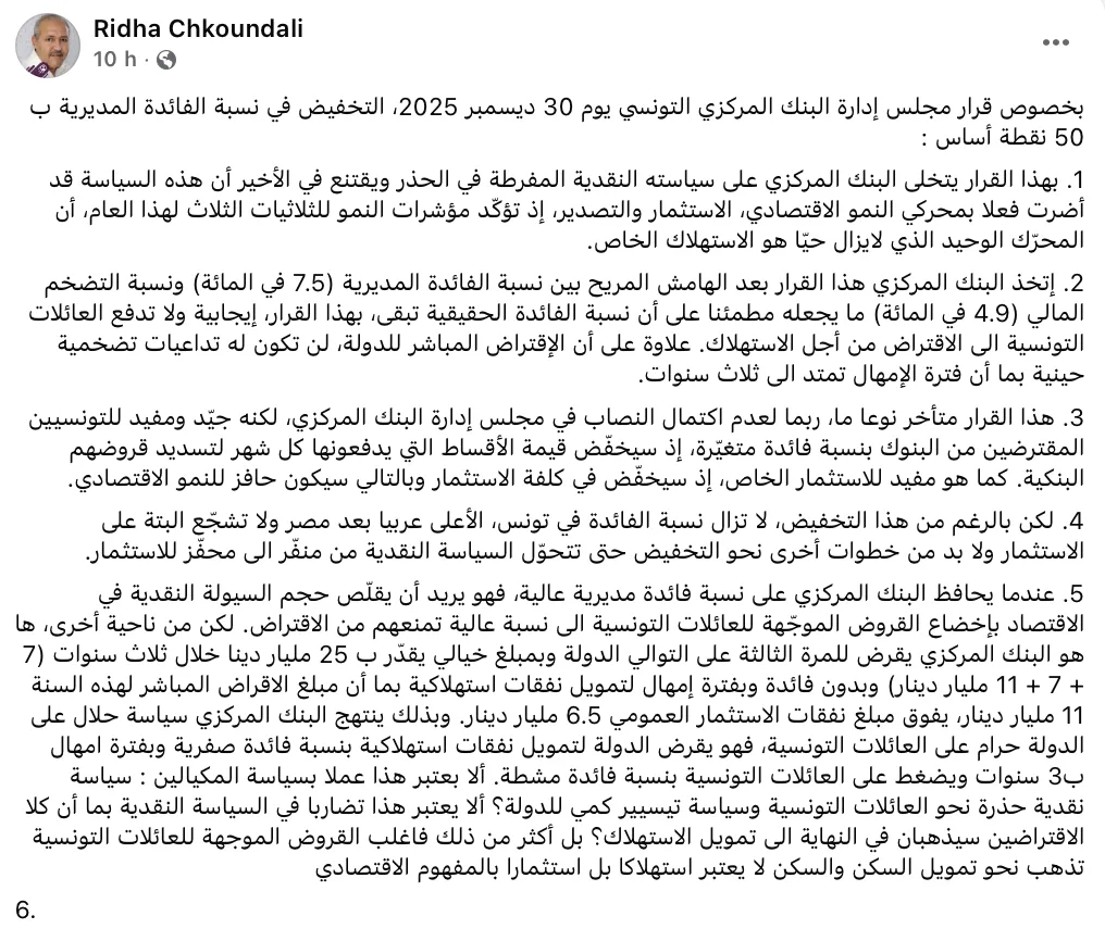 Réagissant à la décision du Conseil d’administration de la Banque centrale de Tunisie (BCT), prise le 30 décembre 2025, de réduire le taux moyen du marché monétaire (TMM) de 50 points de base, le professeur universitaire et économiste Ridha Chkoundali a livré, dans la nuit d jeudi 1er janvier 2026, une analyse approfondie des implications économiques et monétaires de cette mesure, saluant un infléchissement notable tout en en soulignant les limites et les contradictions.