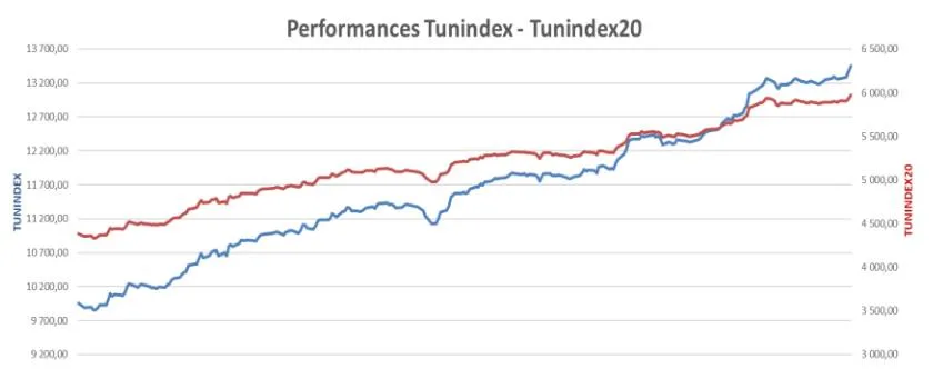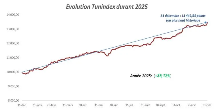 Le Tunindex a franchi pour la première fois la barre symbolique des 13.000 points, pour clôturer l’année à son plus haut niveau historique, à 13.449,95 points. Exprimé en devises, la performance est encore plus marquante : +48,75% en dollar et +32,76% en euro.