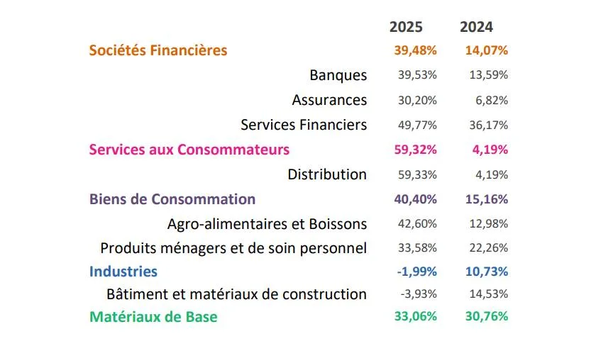 Le secteur des Services aux consommateurs s’est hissé en tête avec un gain spectaculaire de 59,32%, suivi des Biens de consommation (+40,40%) et des Sociétés financières (+39,48%). À l’intérieur de ces secteurs, l’indice Distribution s’est distingué avec une progression de 59,33%, tandis que les Services financiers ont gagné 49,77%.