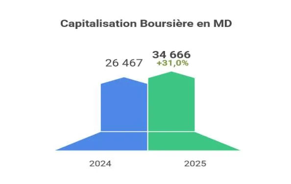 La capitalisation boursière du marché a enregistré une hausse de 31% en 2025, soit une progression de 8,199 milliards de dinars, pour atteindre 34,666 milliards de dinars contre 26,467 milliards de dinars à fin 2024.