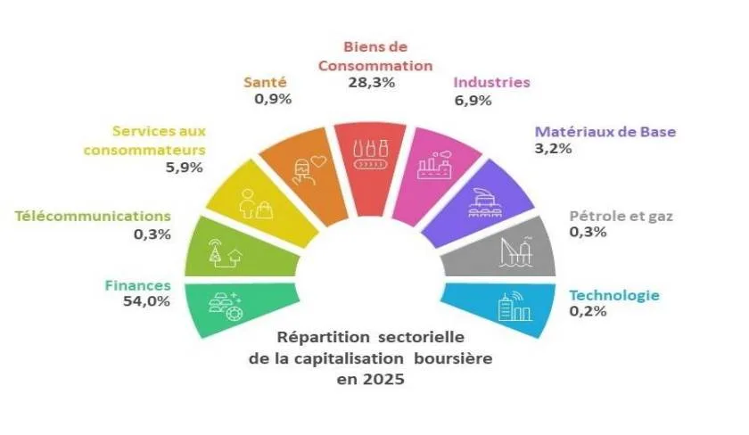 Les Sociétés financières continuent de dominer le marché avec une part de 54% de la capitalisation totale, suivies des Biens de consommation (28,3%) et de l’Industrie (6,9%).