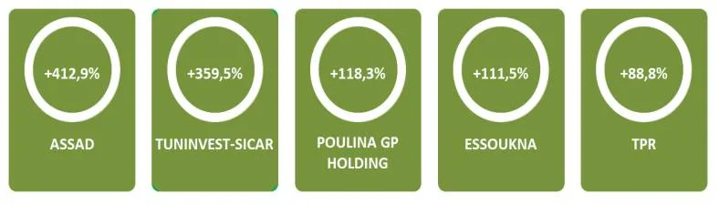 Le titre Assad s’est imposé comme la star de l’année avec une performance exceptionnelle de +412,9%, suivi de Tuninvest-Sicar (+359,5%), PGH (+118,3%), Essoukna (+111,5%) et TPR (+88,8%).