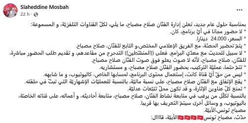 Dans ce message rédigé sur un ton volontairement tranchant, Slah Mosbah annonce une série de conditions strictes encadrant toute invitation médiatique sur les chaînes de télévision et de radio. Il y affirme qu’il n’y aura plus aucun passage gratuit dans les émissions, quel que soit le programme, et fixe le prix de sa participation à 24.000 dinars. Il précise également que toute émission devra être préparée exclusivement avec l’équipe médiatique qui lui est rattachée, sans aucun échange avec les rédacteurs ou préparateurs des programmes, la demande devant être adressée directement à l’artiste.