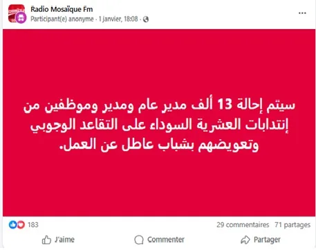 Nos vérifications montrent que cette page non officielle utilise le nom et l’identité visuelle de la radio pour donner de la crédibilité à des informations non fondées. Aucune annonce de ce type n’a été publiée par la radio Mosaïque FM elle-même, ni reprise par des médias fiables. De plus, aucune source officielle n’a confirmé l’existence d’une décision visant à mettre à la retraite, de manière collective et obligatoire, des milliers de fonctionnaires recrutés durant une période politique donnée, encore moins pour les remplacer automatiquement par des jeunes chômeurs, une procédure qui n’existe pas dans le droit administratif tunisien.