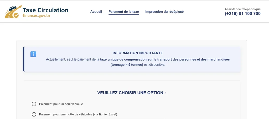 Selon l’information affichée sur la plateforme officielle, ce lundi 5 janvier 2026, seul le paiement de la taxe unique de compensation sur le transport des personnes et des marchandises est, à ce stade, accessible. Cette taxe concerne exclusivement les véhicules dont le tonnage dépasse cinq tonnes, à savoir principalement les poids lourds et les véhicules affectés au transport professionnel.