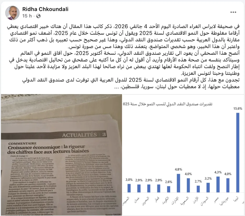 Dans son édition de dimanche, La Presse a publié un article mettant en cause les analyses de l’économiste au sujet de la croissance enregistrée par la Tunisie en 2025. L’auteur de l’article y affirme que Ridha Chkoundali a avancé des chiffres erronés, les estimant également préjudiciables à l’image du pays. Il est même allé jusqu’à prêter à l’expert une intention délibérée de nuire à la réputation de la Tunisie.