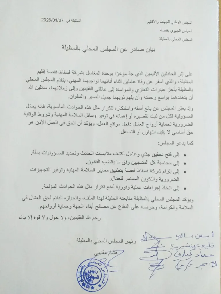 Le Conseil local a formulé plusieurs demandes pressantes à l’attention des autorités compétentes et de la Compagnie des phosphates de Gafsa : l’ouverture immédiate et sérieuse d’une enquête afin de déterminer avec précision les circonstances des accidents et d’identifier les responsabilités ; la sanction de toute personne dont les actions ou omissions auront contribué à ces drames, conformément aux dispositions légales ; l’obligation pour l’entreprise de renforcer ses normes de sécurité, d’assurer la disponibilité de l’équipement nécessaire et de garantir une formation continue aux travailleurs ; ainsi que la mise en place de mesures concrètes et urgentes pour prévenir toute récidive de tels accidents.