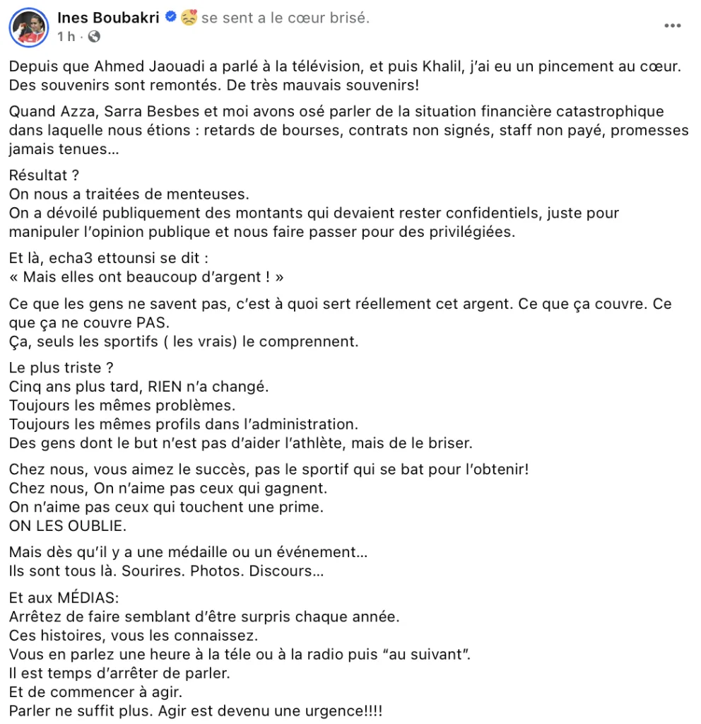 Réagissant aux récentes prises de parole d’Ahmed Jaouadi et de Khalil Jendoubi à la télévision, Ines Boubakri a confié avoir ressenti un « pincement au cœur ». Ces témoignages ont ravivé chez elle de « très mauvais souvenirs », notamment ceux remontant à l’époque où elle-même, aux côtés d’autres athlètes, avait osé dénoncer publiquement la situation catastrophique dans laquelle elles se trouvaient.
