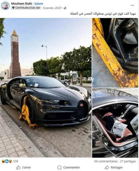 Une publication circule largement sur Facebook depuis le 6 janvier 2026 et a suscité des centaines de réactions, entre moqueries, indignation et commentaires ironiques. On y voit une voiture de luxe, présentée comme une Bugatti, immobilisée en pleine avenue Habib Bourguiba à Tunis, avec une roue bloquée par un sabot de fourrière. Le message qui accompagne l’image est sans équivoque : « Peu importe ta puissance, en Tunisie, on te met le bâton dans la roue ». Une formule largement reprise et détournée par de nombreux internautes.