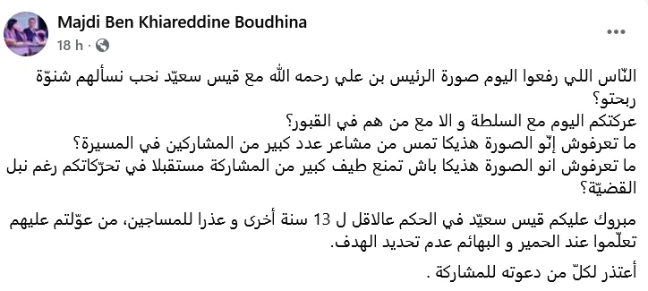 Pour lui, « mélanger Ben Ali et Kaïs Saïed dans une marche contre l’autoritarisme actuel n’est pas un acte de courage politique, mais une erreur de jugement qui poignarde le front de lutte de l’intérieur ».