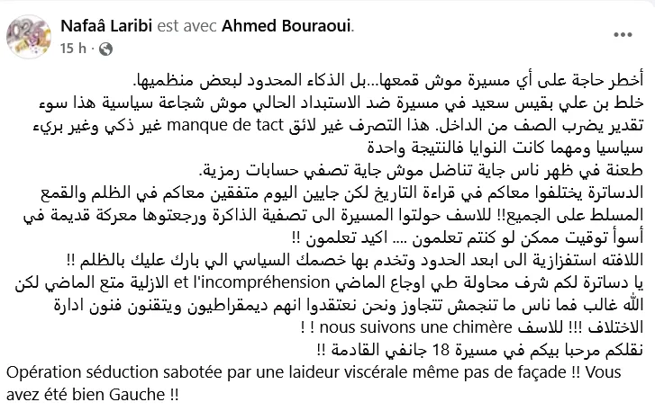 Il s’est adressé aux destouriens disant que ces gens ne peuvent pas dépasser les divergences du passé et que, malheureusement, ils suivaient « une chimère ». L’avocat conclut en ces termes : « Opération séduction sabotée par une laideur viscérale même pas de façade !! Vous avez été bien Gauche !! »