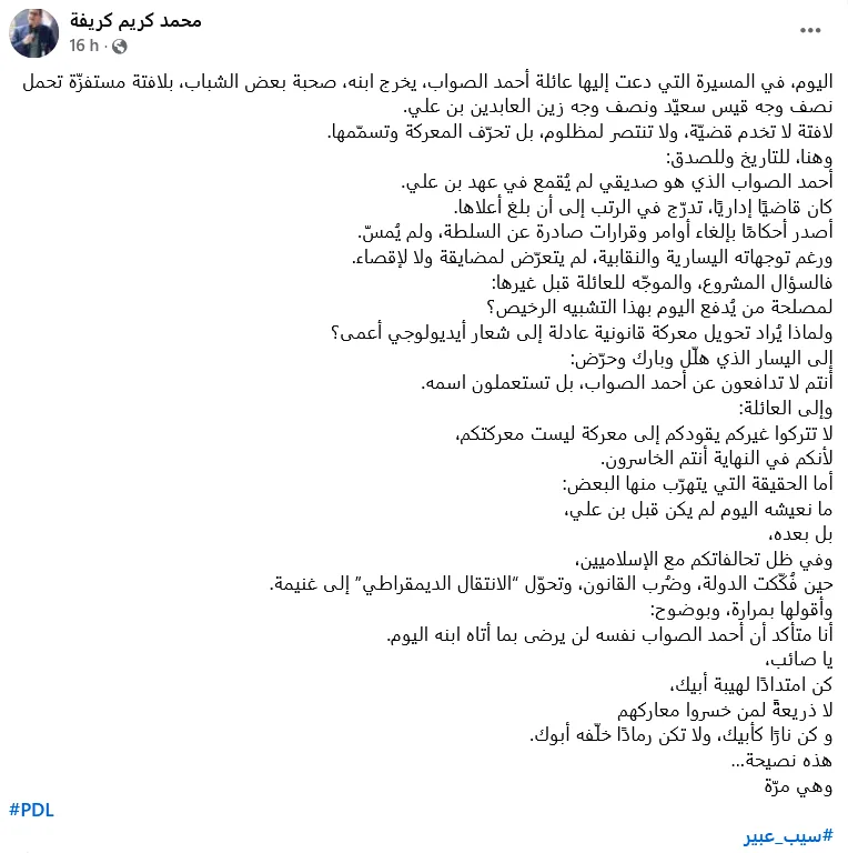 Il s’interroge : « Dans l’intérêt de qui pousse-t-on aujourd’hui cette comparaison grossière ? Et pourquoi cherche-t-on à transformer une bataille juridique juste en un slogan idéologique aveugle ? ». Avant d’asséner ce qu’il présente comme une vérité occultée : « Ce que nous vivons aujourd’hui n’existait pas avant Ben Ali, mais après lui. »