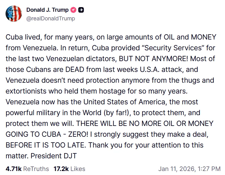Dans un message publié dimanche 11 janvier 2026 sur son réseau Truth Social, Trump s’est attaqué frontalement à La Havane, accusée d’avoir longtemps vécu grâce au pétrole et à l’argent vénézuéliens, en échange de « services de sécurité » fournis aux dirigeants de Caracas. Une relation que le président américain affirme désormais révolue.