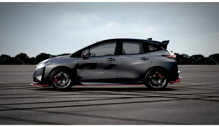 Le design extérieur fait évoluer le concept « Agile Electric City Racer » de l’Aura Nismo vers une expression plus musclée et résolument orientée performance, avec des surfaces plus tendues et affirmées. Les ailes élargies de 145 mm, associées à une hauteur de caisse abaissée de 20 mm, contribuent à abaisser le centre de gravité et à renforcer la posture dynamique du véhicule.