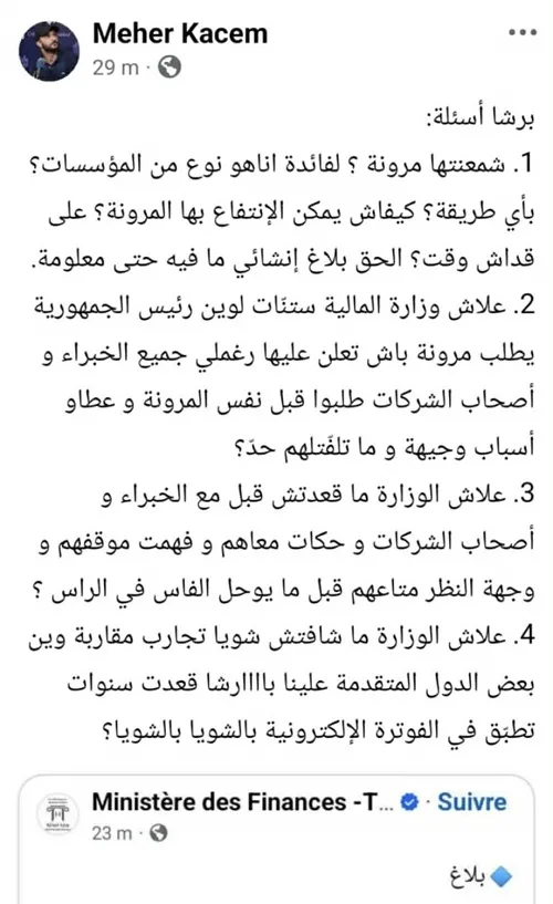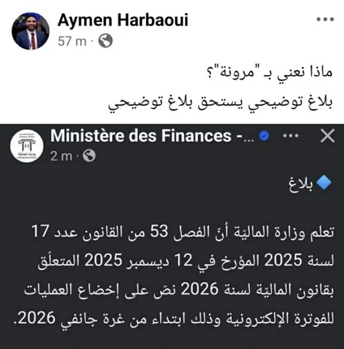 D’autres internautes dénoncent le manque de concertation préalable et l’impréparation du dispositif. Ils estiment que le ministère aurait dû, en amont, associer les experts, les professions concernées et les représentants des entreprises, et s’inspirer d’expériences internationales où la facturation électronique a été introduite de manière progressive, avec des phases pilotes, des délais transitoires et un cadre juridique clairement balisé.